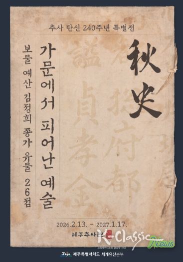 K-Classic News 기자 | 제주특별자치도 세계유산본부가 추사 김정희(1786~1856) 탄신 240주년을 기념해 예산 김정희 종가에서 전래된 보물급 유물들을 한자리에서 선보인다.