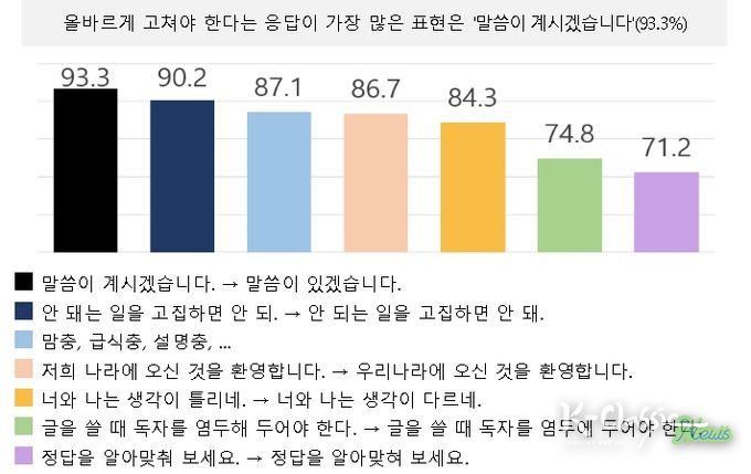 조사 결과 총 30개의 어려운 어휘, 잘못된 표현에 대해 ‘바꿔야 한다고 생각한다’라고 응답한 비율은 평균 61.8%로, 쉽고 바른 말을 사용하자는 응답이 전체적으로 많았다. 특히 13개 항목은 70% 이상, 그중 5개 항목은 80% 이상의 응답자가 바꾸어 써야 한다고 답하는 등 개선 요구가 높게 나타났다.