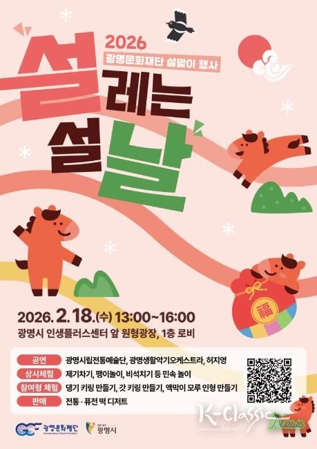 K-Classic News 기자 | (재)광명문화재단은 설 명절을 맞아 오는 2월 18일 13시에 광명 인생플러스센터 앞 원형 광장과 1층 로비에서‘설레는 설날’ 행사를 개최한다고 밝혔다.