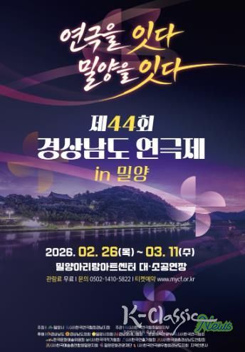 K-Classic News 기자 | 밀양시는 경남 연극인들의 최대 축제이자 경연대회인 ‘제44회 경상남도 연극제’가 오는 2월 26일부터 3월 11일까지 14일간 밀양아리랑아트센터에서 개최된다고 밝혔다.