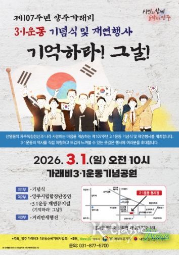 양주시 관계자는 “제107주년을 맞아 열리는 이번 기념 행사가 선열들의 희생과 애국정신을 다시 한번 마음에 새기는 계기가 되길 바란다”며 “많은 시민들이 함께해 자랑스러운 우리 고장의 역사를 기억하고, 그 정신을 미래 세대에 이어가는 소중한 시간이 되길 기대한다”고 전했다.