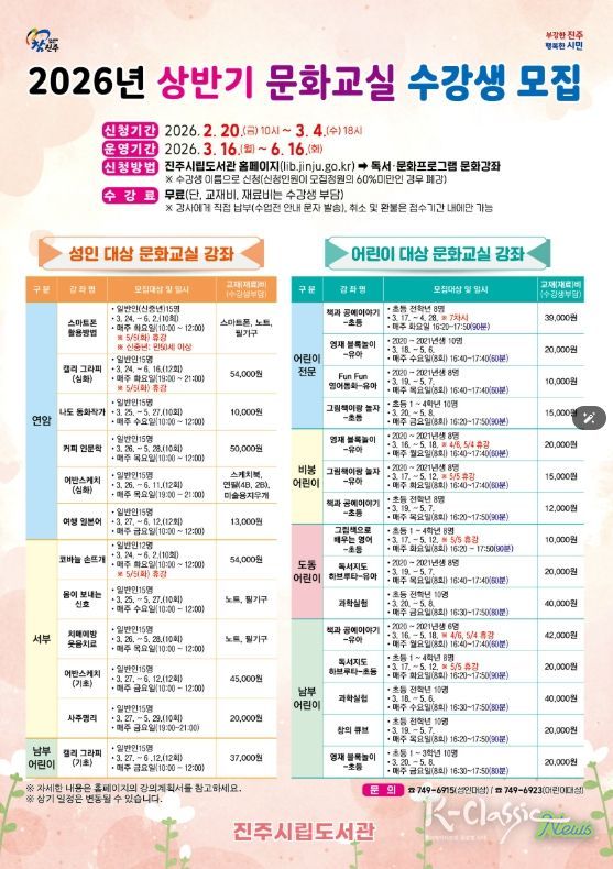 K-Classic News 기자 | 진주시립도서관은 오는 20일부터 어린이와 성인을 대상으로 ‘2026년 상반기 문화교실’ 수강생을 모집한다.