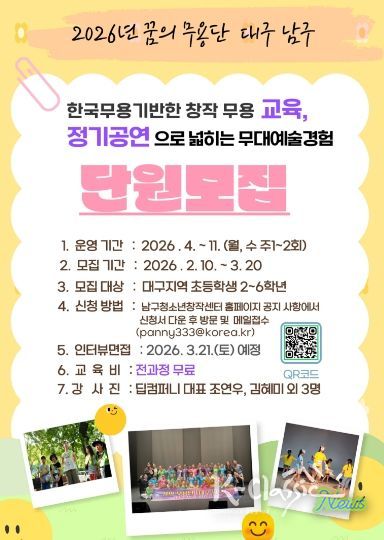 남구청소년창작센터 관계자는 “꿈의 무용단은 단순한 무용 교육이 아니라, 아이들이 스스로를 발견하고 함께 성장하는 과정”이라며 “지역 아동들이 예술을 통해 자신의 가능성을 펼칠 수 있도록 적극 지원하겠다.”라고 밝혔다.