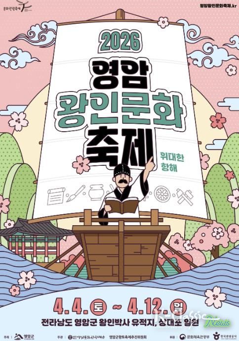 K-Classic News 기자 | 벚꽃이 만개하는 화창한 봄을 맞아 문화관광축제인 ‘2026 영암왕인문화축제’가 오는 4월 4일부터 12일까지 왕인박사유적지 일원에서 개최된다. (재)영암문화관광재단은 올해 축제의 주제를 ‘위대한 항해’로 정하고, 전국 각지에서 방문하는 관광객들이 축제 속에서 왕인박사가 우리에게 주는 의미와 다양한 매력들을 발굴하며 벚꽃과 함께 더 아름다운 모습으로 영암의 다채로운 매력들을 널리 알릴 수 있는 축제로 운영할 계획이라고 밝혔다.