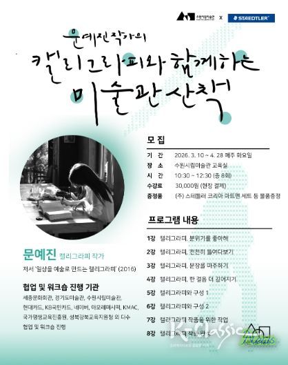 K-Classic News 기자 | 수원시립미술관은 독일 문구 기업 ㈜스테들러 코리아와 공동으로 '캘리그라피와 함께하는 미술관 산책'을 3월 10일부터 4월 28일까지 운영하며 참가자를 모집한다.