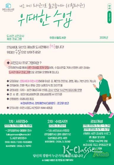 K-Classic News 기자 | 이천시 도서관이 은퇴세대 시민의 전문성과 경험을 지역사회와 연결하는 ‘나는 다시 도서관으로 출근합니다’ 사업을 2026년 3월부터 본격 운영한다. 이번 사업은 50대 이상 은퇴세대를 대상으로 새로운 사회적 역할과 참여 기회를 제공하는 것을 목표로 한다.