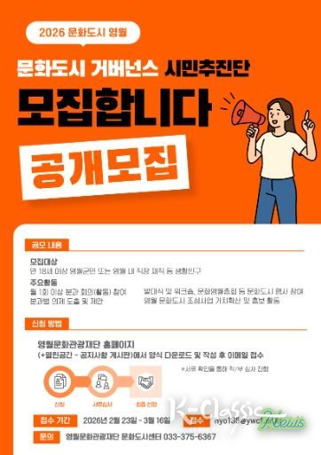K-Classic News 기자 | (재)영월문화관광재단(대표이사 박상헌)은 23일 문화도시 거버넌스의 핵심 주체로 활동할 '문화도시 시민추진단'을 공개 모집한다고 밝혔다.