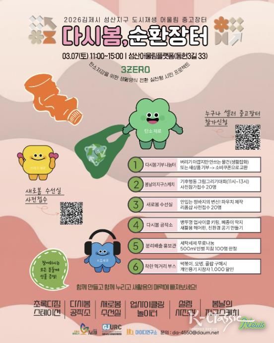 정성주 김제시장은 “다시봄 순환장터는 단순한 중고장터를 넘어 시민이 직접 참여하고 실천하는 자원순환 플래폼”이라며 “생활 속 작은 실천이 지역의 지속가능성을 만드는 출발점이 되길 기대한다”고 말했다.