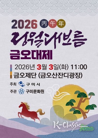 K-Classic News 기자 | 구미시는 2026년 정월대보름을 맞아 3월 3일 오전 11시 금오산 잔디광장 금오제단에서 '2026 병오년 금오대제'를 개최한다. 한 해의 액운을 떨치고 시민의 안녕과 지역 발전을 기원하는 전통 제례 행사다.