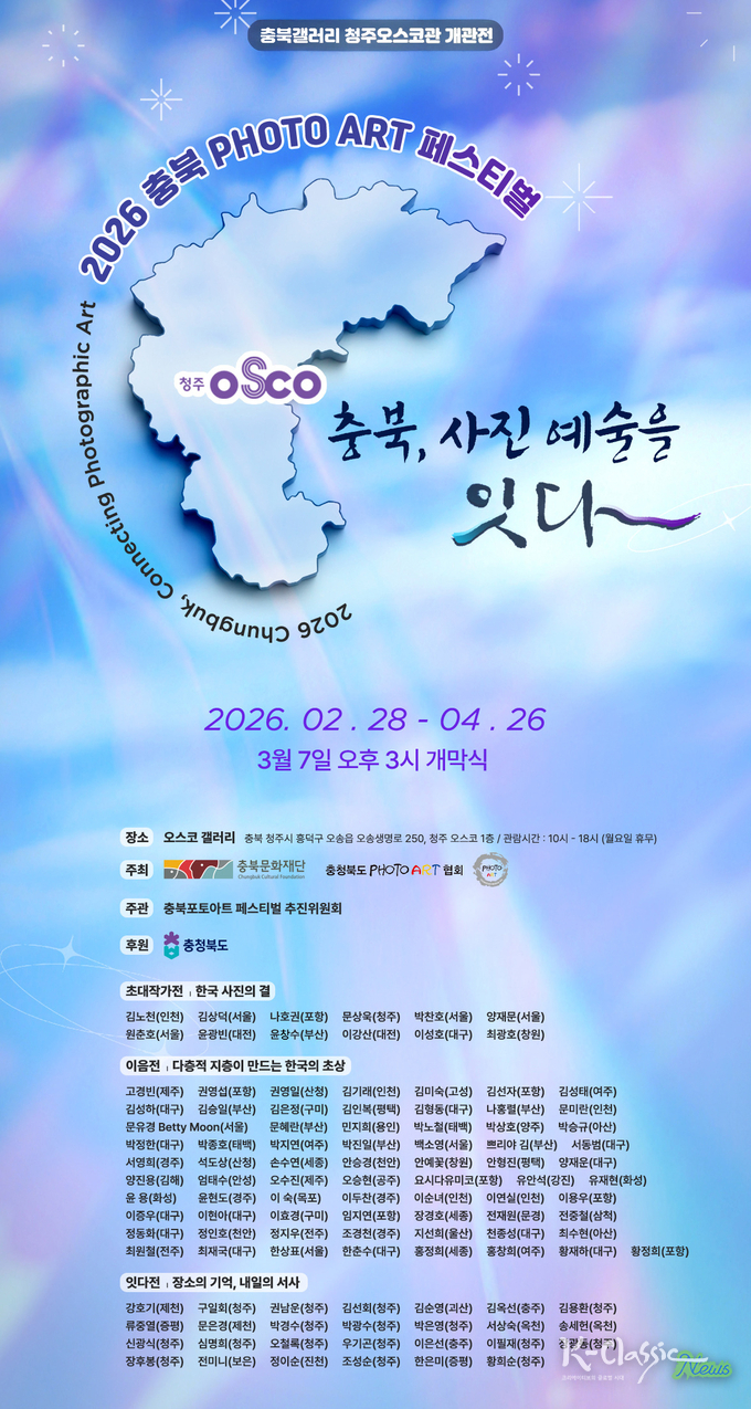 충북문화재단(대표이사 김경식)은 청주오스코 1층에 '충북갤러리 청주오스코관'을 조성하고, 개관을 기념해 2월 28일부터 4월 26일까지(월요일 휴관) '2026 충북 PHOTO ART 페스티벌' <충북, 사진 예술을 잇다>를 개최한다고 밝혔다.
