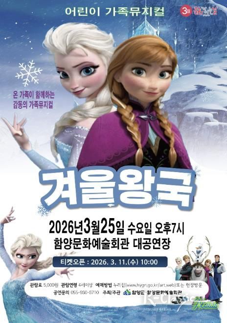K-Classic News 기자 | 함양문화예술회관은 3월 문화가 있는 날을 맞아 온 가족이 함께 즐길 수 있는 가족뮤지컬 ‘겨울왕국’을 오는 3월 25일 오후 7시 문화예술회관 대공연장에서 개최한다고 밝혔다.
