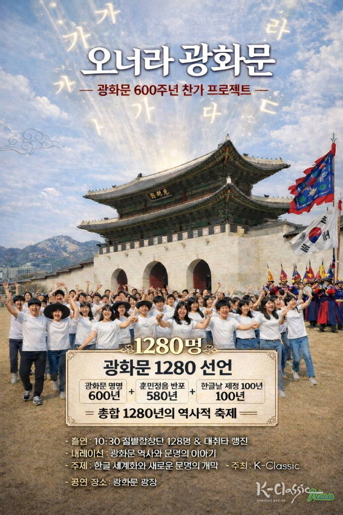 광화문 광장에서 울려 퍼질 합창곡 「오너라 광화문」은 단순한 공연이 아니다. 이번 프로젝트에서 젊별합창단(스타 코러스) 1,280명이 참여하는 것은 깊은 역사적 상징을 담고 있다. 이 1,280이라는 숫자는 한국 문명의 세 시간을 합한 것이다. 광화문 명명 600년 훈민정음 반포 580년, 한글날 제정 100년 이 세 시간을 합하면 1,280년의 의미가 된다.