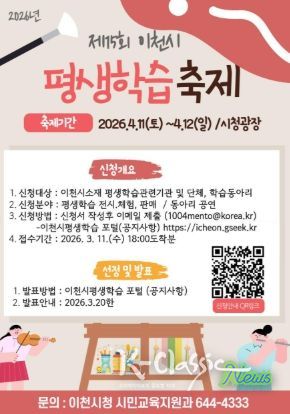 K-Classic News 기자 | 이천시는 오는 4월 11일부터 12일까지 이틀간 이천시청 모두의광장 일원에서 ‘제15회 이천시 평생학습축제’를 개최한다고 밝혔다.