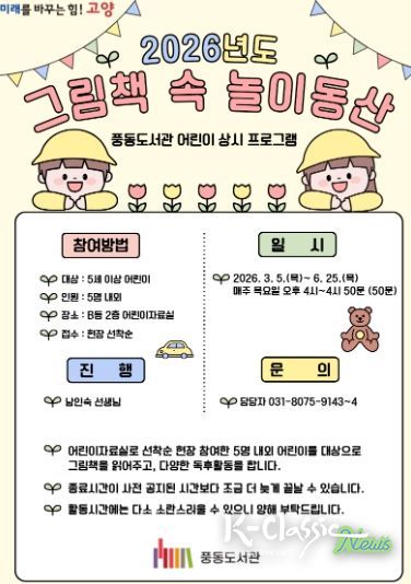 K-Classic News 기자 | 고양특례시 풍동도서관은 어린이 그림책 읽어주기 상시 프로그램 ‘그림책 속 놀이동산’을 운영한다고 5일 밝혔다.