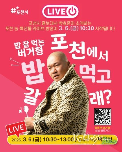 이번 방송은 오는 3월 6일 오전 10시 30분부터 유튜브 채널 ‘버거형’을 통해 실시간으로 진행되며, 포천의 우수한 농·특산물을 널리 알리고 소비자와의 소통을 강화하기 위해 마련됐다.