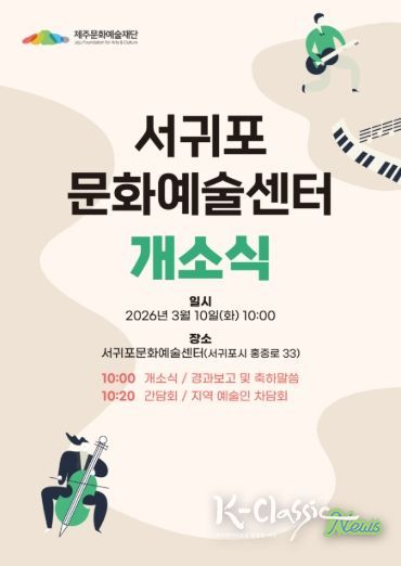K-Classic News 기자 | 제주문화예술재단은 오는 3월 10일 오전 10시 서귀포문화예술센터(서귀포시 홍중로 33)에서 개소식을 개최한다. 재단은 이번 개소를 계기로 산남지역 문화예술 지원 기능을 전담하는 거점 체계를 본격 운영할 계획이다.