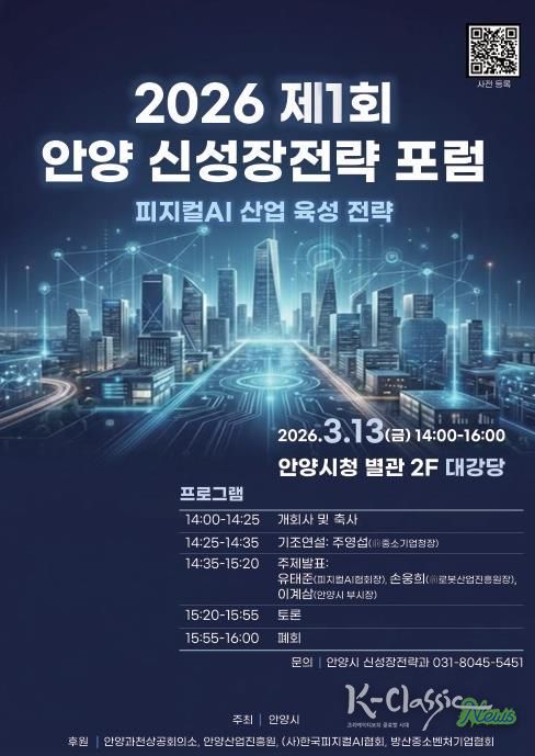 K-Classic News 기자 | 안양시는 미래 신산업 육성과 지역 산업 경쟁력 강화를 모색하기 위한 ‘2026 제1회 안양 신성장전략 포럼’을 이달 13일 오후 2시 안양시청 별관 2층 대강당에서 개최한다고 9일 밝혔다.