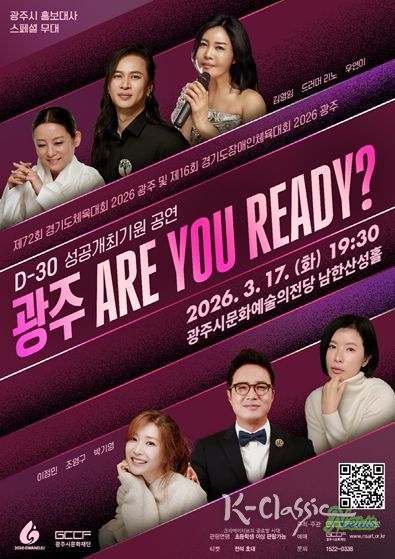 K-Classic News 기자 | 광주시문화재단은 오는 3월 17일 오후 7시 30분, 광주시문화예술의전당 남한산성홀에서 ‘제72회 경기도체육대회 2026 광주 및 제16회 경기도장애인체육대회 2026 광주 D-30 성공기원 공연’ '광주! ARE YOU READY?'’를 개최한다.