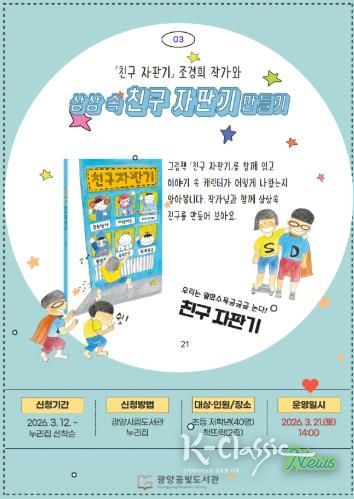 참가 신청은 3월 12일 오전 10시부터 광양시립도서관 누리집에서 선착순으로 접수하며, 광양시에 거주하는 초등학생 40명을 대상으로 한다.