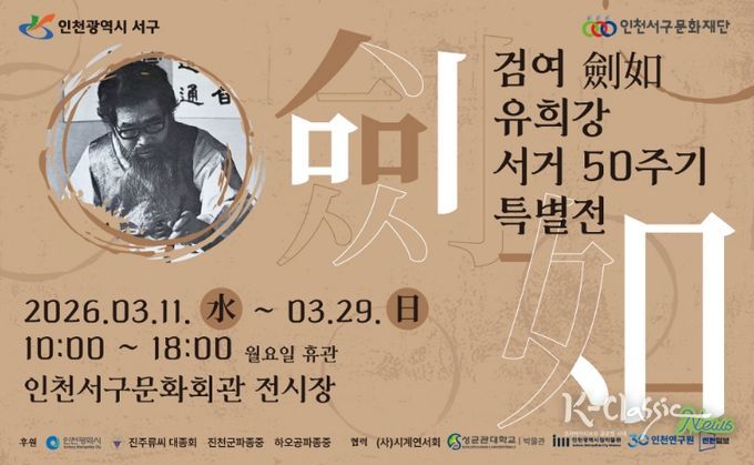 K-Classic News 기자 | (재)인천서구문화재단은 오는 3월 11일부터 3월 29일까지 인천서구문화회관 전시장에서 ‘검여 유희강 선생 50주기 기념 특별전’을 개최한다.