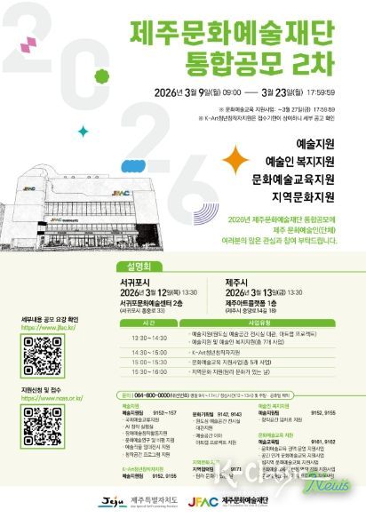 K-Classic News 기자 | 제주문화예술재단은 도내 예술인의 창작 활동 지원과 지속가능한 문화예술 생태계 조성을 위해 ‘2026년 지원사업 통합공모 2차’를 3월 23일까지 진행한다.