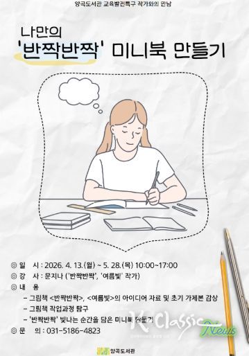 K-Classic News 기자 | 김포시 양곡도서관은 2026년 교육발전특구 사업의 일환으로 4월 13일부터 5월 28일까지 관내 초등학생을 위한 스트레스 관리 프로그램 '나만의 ‘반짝반짝’ 미니북 만들기'를 운영한다.