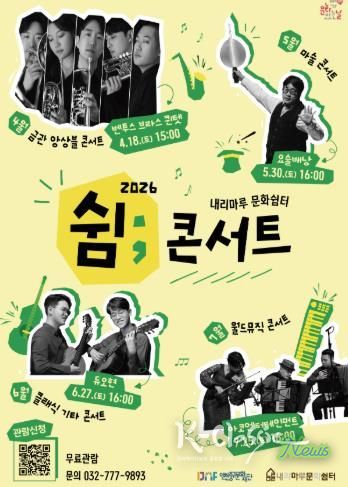 K-Classic News 기자 | (재)인천중구문화재단은 오는 4월부터 7월까지 ‘내리마루 문화쉼터’ 햇살마루에서 월간 공연 프로그램인 '쉼; 콘서트'를 개최한다고 밝혔다.