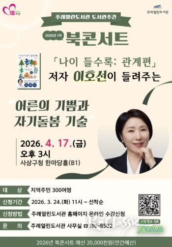 K-Classic News 기자 | 사상구 주례열린도서관은 ‘도서관의 날’과 ‘도서관 주간’을 맞아 오는 4월 17일 오후 3시 사상구청 한마당홀에서 “어른의 기쁨과 자기돌봄 기술” 을 주제로 이호선 교수를 초청해 북콘서트를 개최한다.