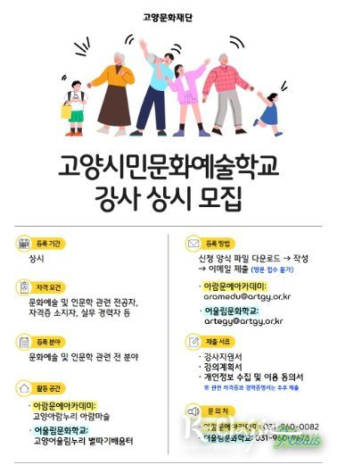 K-Classic News 기자 | 고양문화재단은 시민들에게 참신하고 수준 높은 문화예술교육 서비스를 제공하기 위해 ‘고양시민문화예술학교’(아람문예아카데미 및 어울림문화학교) 강사 인력풀(POOL)을 상시 모집한다.