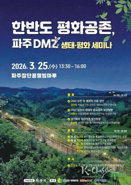 K-Classic News 기자 | 파주시는 오는 25일 13시부터 16시까지 파주장단콩웰빙마루(탄현면 필승로 396) 2층에서 ‘한반도 평화공존, 파주 디엠지(DMZ) 생태·평화 세미나’를 개최한다.