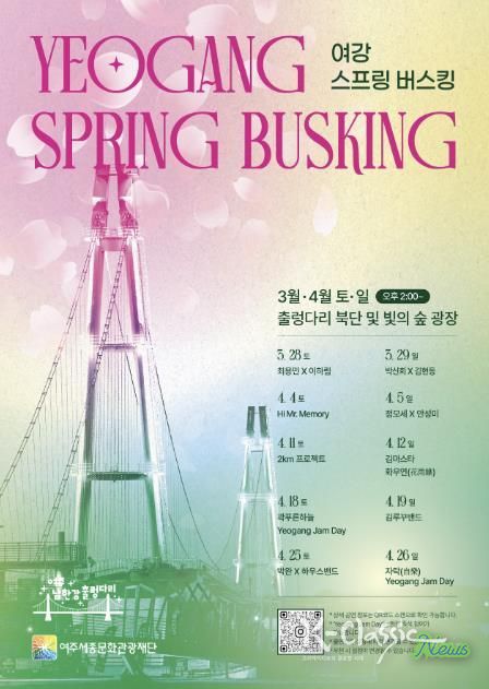 K-Classic News 기자 | 여주세종문화관광재단은 남한강의 수려한 자연경관과 출렁다리 경관을 배경으로 시민과 관광객에게 색다른 문화 향유 기회를 제공하기 위해 ‘2026년 상반기 여주 남한강 출렁다리 버스킹 공연’을 운영한다고 밝혔다.