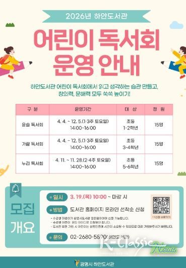 K-Classic News 기자 | 광명시 하안도서관은 어린이들이 올바른 독서 습관을 형성하고 기초 문해력을 기를 수 있도록 ‘2026년 어린이 독서회’ 참여 회원을 모집한다.