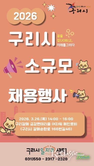 K-Classic News 기자 | 구리시는 오는 3월 26일 오후 2시부터 4시까지 갈매동 금강펜테리움IX 타워 로비에서 구리시 일자리센터 주관으로 소규모 채용행사를 개최한다고 밝혔다.