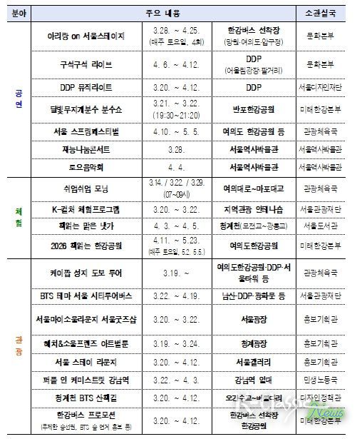 2026 서울스프링페스티벌(4.10.~5.5.), 동대문디자인플라자(DDP) 뮤직라이트쇼(4.6.~4.12.), K-pop 성지 도보관광코스(3.19.~), 서울스테이 라운지(3.20.~4.12.) 등을 3~4월 집중운영한다.