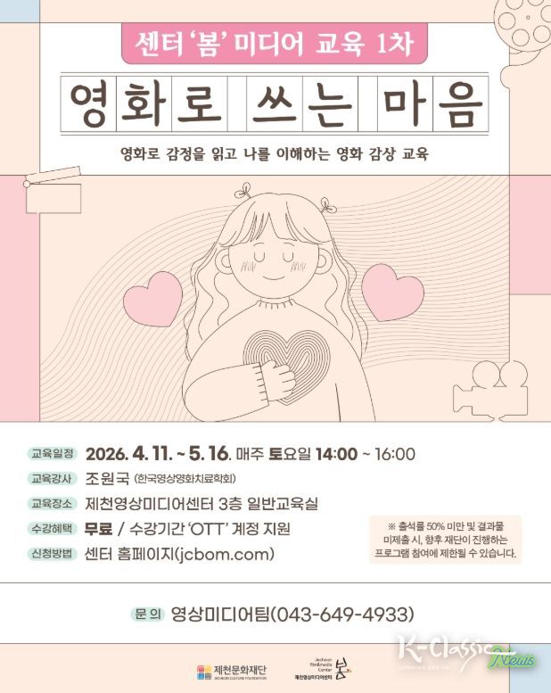 K-Classic News 기자 | 제천문화재단이 24일부터 영화 감상 인문학 교육 [영화로 쓰는 마음]의 수강생을 모집한다.