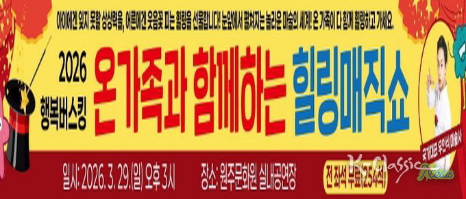 K-Classic News 기자 | 2026 원주행복버스킹이 ‘온 가족과 함께하는 힐링매직쇼’로 화려한 개막을 알린다. 이번 버스킹은 지역 예술가들의 공연 기회를 확대하고 다양한 장르의 예술공연을 선보여 시민들에게 문화서비스를 제공하기 위해 마련됐다.