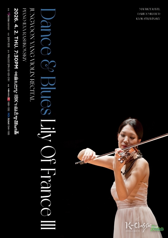 K-Classic News 오형석 기자 |바이올리니스트 양정윤이 오는 4월 2일(목) 오후 7시 30분, 예술의전당 IBK기업은행챔버홀에서 독주회 ‘릴리 오브 프랑스(Lily of France) III’를 개최한다. 지난 2023년부터 시작된 ‘릴리 오브 프랑스’ 시리즈는 프랑스 음악 특유의 섬세한 화성과 유려한 음색, 그리고 시대를 관통하는 예술적 감수성을 깊이 있게 조명해온 양정윤의 대표 프로젝트다. 이번 세 번째 무대는 라벨, 미요, 스트라빈스키의 작품을 중심으로, 춤곡과 블루스, 그리고 벨 에포크 이후 유럽 음악의 다층적인 감각을 입체적으로 풀어낼 예정이다.