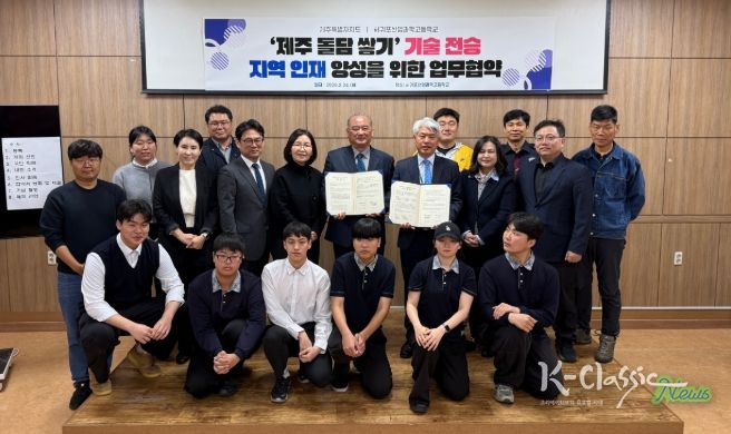 K-Classic News 기자 | 제주특별자치도 돌문화공원관리소(소장 이상효)와 서귀포산업과학고등학교(교장 문경삼)가 24일 오전 서귀포산업과학고등학교에서 ‘제주 돌담 쌓기’ 기술의 전승과 전문 인력 양성을 위한 업무협약을 맺었다.