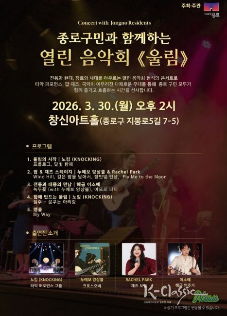 K-Classic News 기자 | 종로구가 봄을 맞아 도심 곳곳을 문화의 온기로 채울 무료 음악 공연을 선보인다.