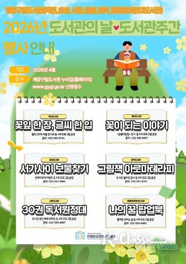 K-Classic News 기자 | 인천 계양구립도서관[(재)인천광역시계양구인재양성장학교육재단]은 오는 4월 도서관의 날·도서관주간을 맞아 지역주민의 도서관 이용 활성화를 위해 다양한 독서문화 행사를 운영한다고 밝혔다.