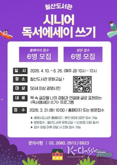 K-Classic News 기자 | 광명시 철산도서관이 신중년 대상 ‘시니어 독서에세이 쓰기’ 프로그램 수강생을 오는 31일부터 모집한다.