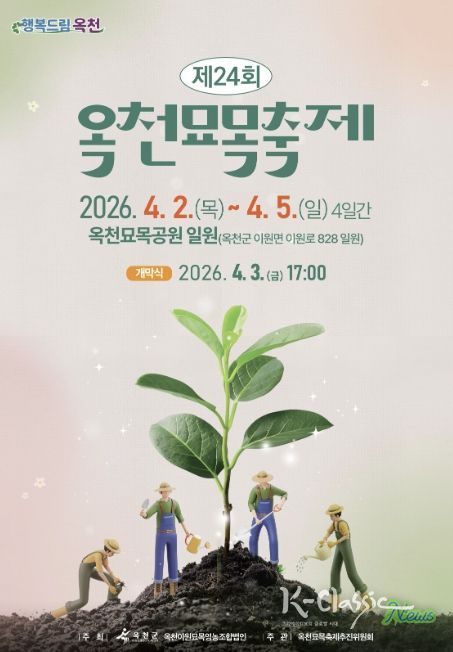 K-Classic News 기자 | 옥천군은 오는 4월 2일부터 5일까지 4일간 옥천묘목공원(이원면 이원로 828) 일원에서 제24회 옥천묘목축제를 개최한다. 올해 축제는 기존 3일에서 하루 연장해 총 4일간 진행되며, 체험 중심 프로그램과 다양한 공연, 볼거리로 방문객을 맞이할 예정이다.