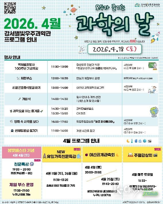 K-Classic News 기자 | 서울 강서구 강서별빛우주과학관은 ‘과학의 달’ 4월을 맞아 온 가족이 함께 즐길 수 있는 과학 체험 행사와 천문 프로그램을 운영한다.