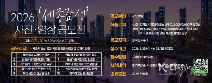 K-Classic News 기자 | 세종시문화관광재단(대표이사 박영국)은 세종시의 도시 일상 감성과 관광 매력을 담은 ‘2026 세종감성 사진영상 공모전’을 개최한다고 밝혔다.
