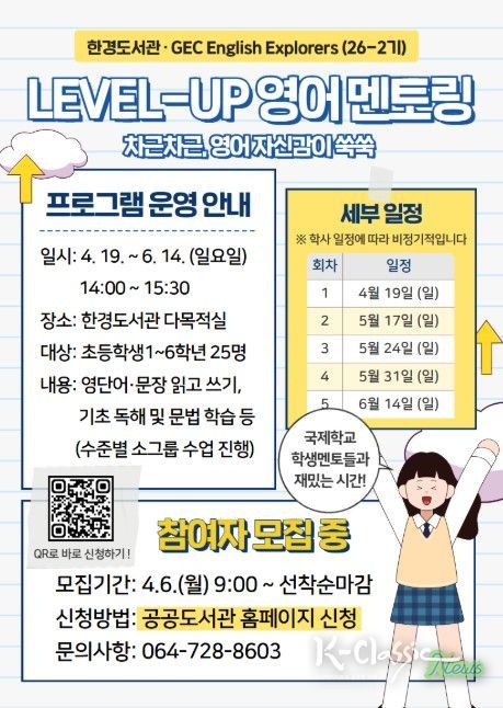 K-Classic News 기자 | 제주시 한경도서관은 지역 어린이들의 영어 기초 학습을 지원하기 위해 ‘레벨업 영어 멘토링’을 운영하고 참여자를 모집한다.