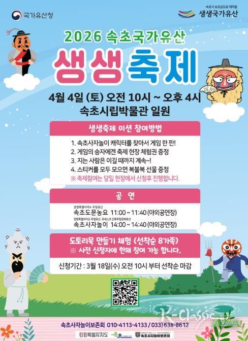 K-Classic News 기자 | 국가유산청 공모사업인 ‘2026년 생생국가유산 사업’의 하나로 마련된 ‘2026 속초국가유산 생생축제’가 오는 4월 4일(토) 속초시립박물관에 열린다.