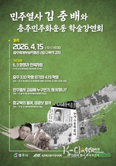 K-Classic News 기자 | 충주문화원(원장 유진태)은 ‘민주열사 김중배와 충주 민주화 운동’ 이라는 주제로 오는 15일(수) 오후 2시 충주세계무술박물관 2층 다목적강당에서 학술강연회를 개최한다.
