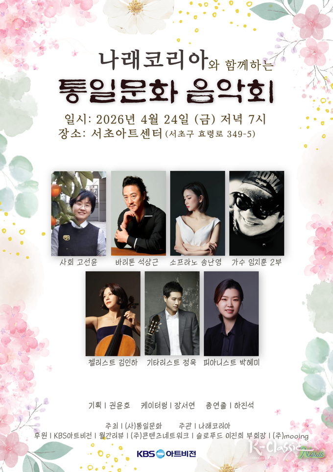 오는 24일 서울 서초아트센터에서 열리는 '나래코리아와 함께 하는 통일문화 음악회'는 통일을 정치적 구호나 제도적 언어가 아닌, 감정과 기억, 공감의 차원에서 다시 건네보려는 시도다. 거창한 담론보다 사람의 마음에 먼저 닿는 방식을 택한 무대라는 점에서 눈길을 끈다.