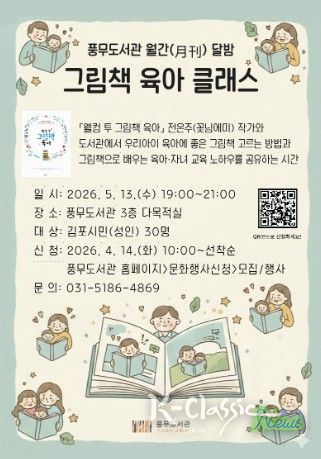 K-Classic News 기자 | 김포시 풍무도서관은 오는 5월 13일 오후 7시부터 야간 인문학 프로그램 ‘그림책 육아 클래스’를 운영한다.