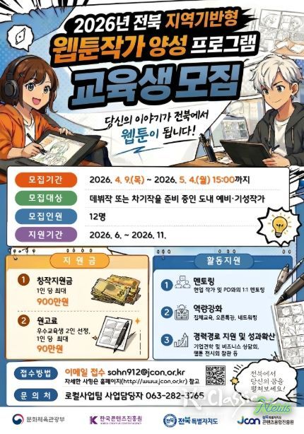 K-Classic News 기자 | (재)전북특별자치도 콘텐츠융합진흥원(이하 진흥원, 원장 김성규)은 전북 웹툰 산업의 미래를 이끌어갈 인재 발굴을 위해‘2026년 전북 웹툰작가 양성 프로그램’ 교육생 12명을 모집한다고 밝혔다.
